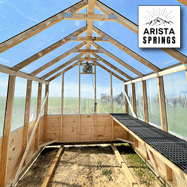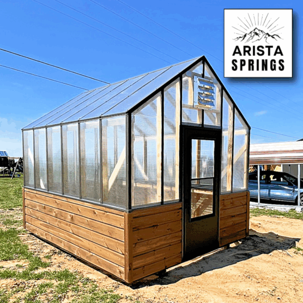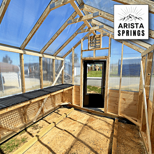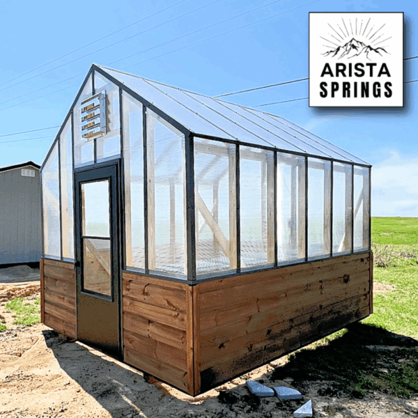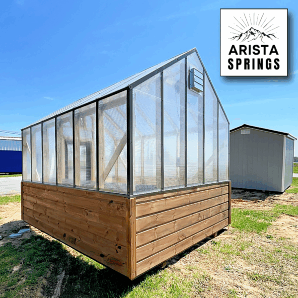 Features: Stained Wood Upgrade, Storm Door Upgrade, 8 mm Twin-Wall Polycarbonate, Worry Free Thermostat Controlled Exhaust Fan / Electric, Heat Activated Intake Vent, 2′ Plastic Gardening Bench, (2) Ground Anchors Included