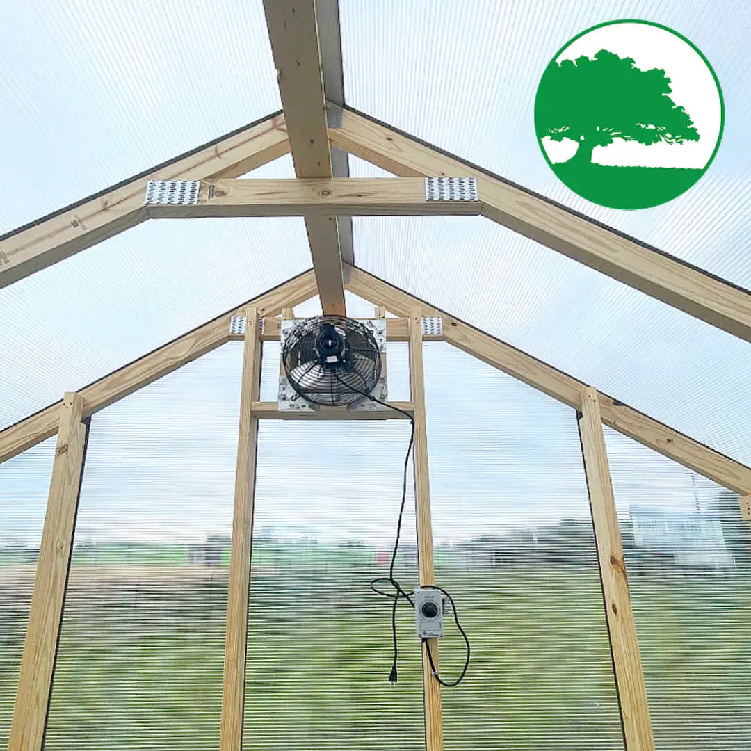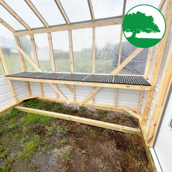 Features:  Storm Door Upgrade (White), 8 mm Twin-Wall Polycarbonate, Worry Free Thermostat Controlled Exhaust Fan / Electric, Heat Activated Intake Vent, 2′ Plastic Gardening Bench, (2) Ground Anchors Included