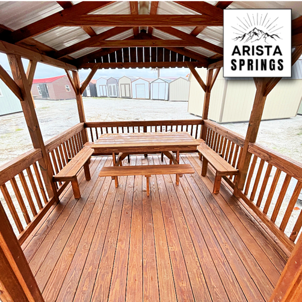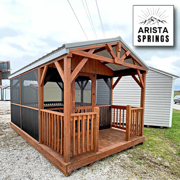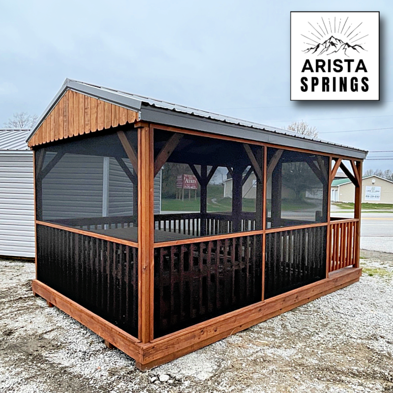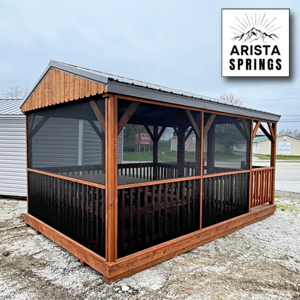 Features: 9′ 6″ Overall Height, 4′ x 4′ Posts, 5/4″ x 6″ Decking, Covered Front Porch, 4″ x 6″ Pressure Treated Runners, 29 Gauge Metal Roof, Screen Door, Built-In Table w/ Benches, Free Delivery with Blocks​