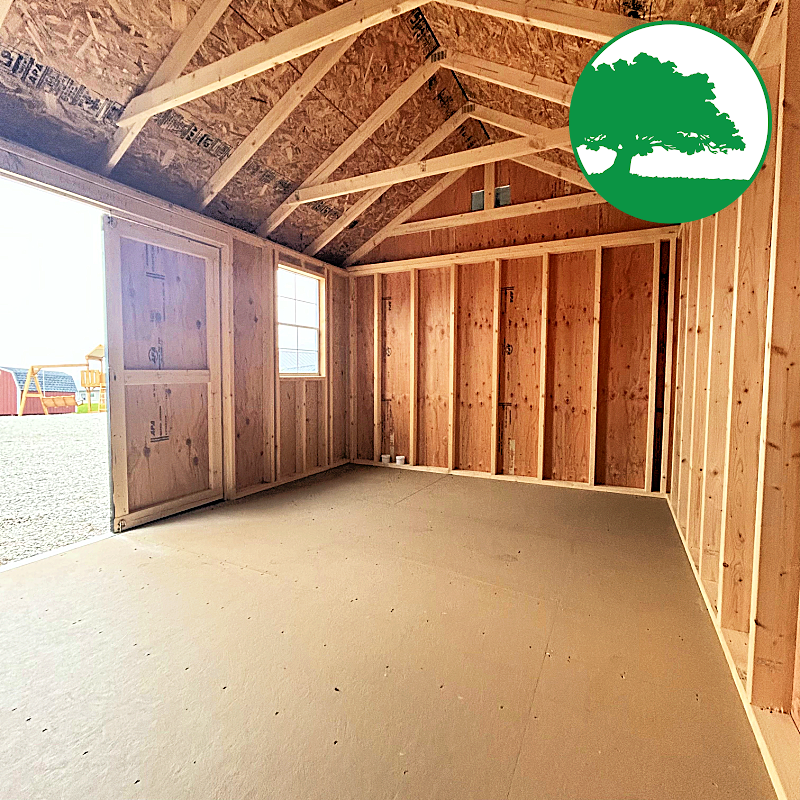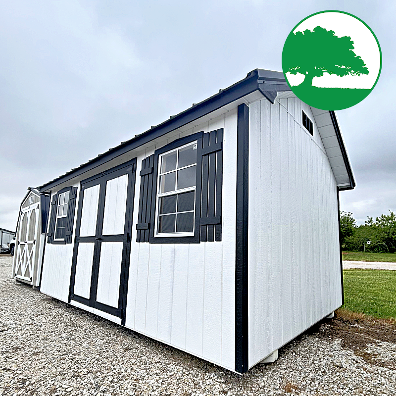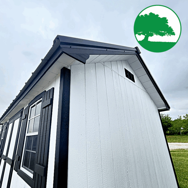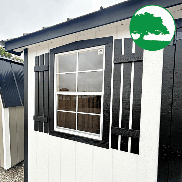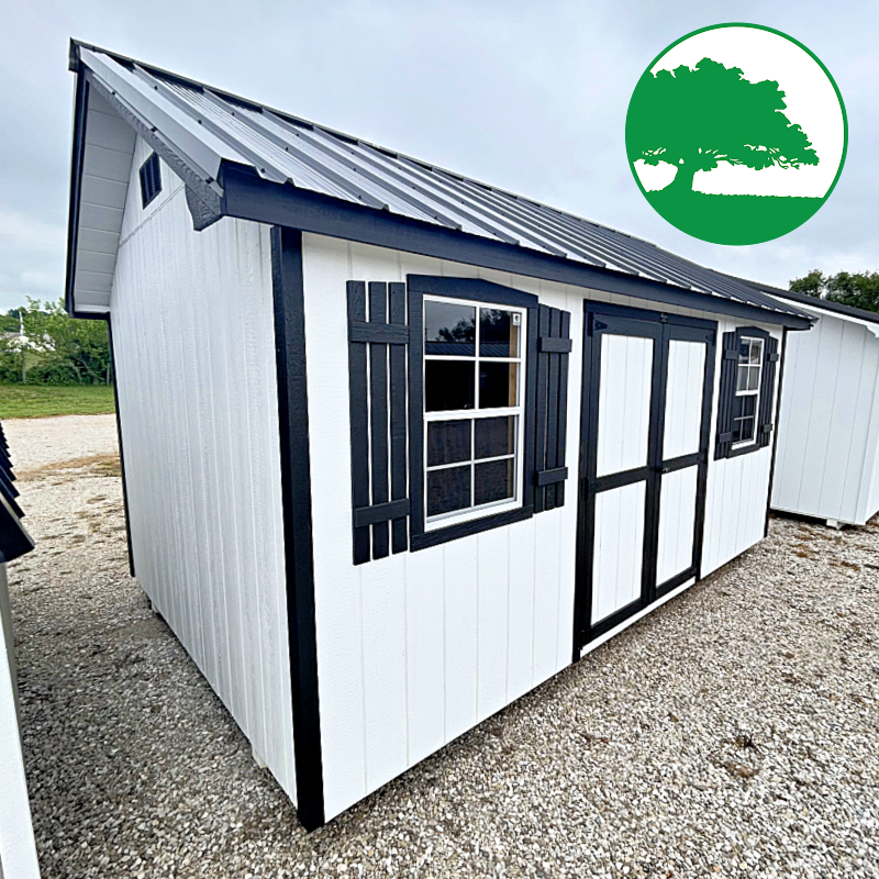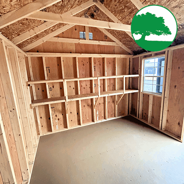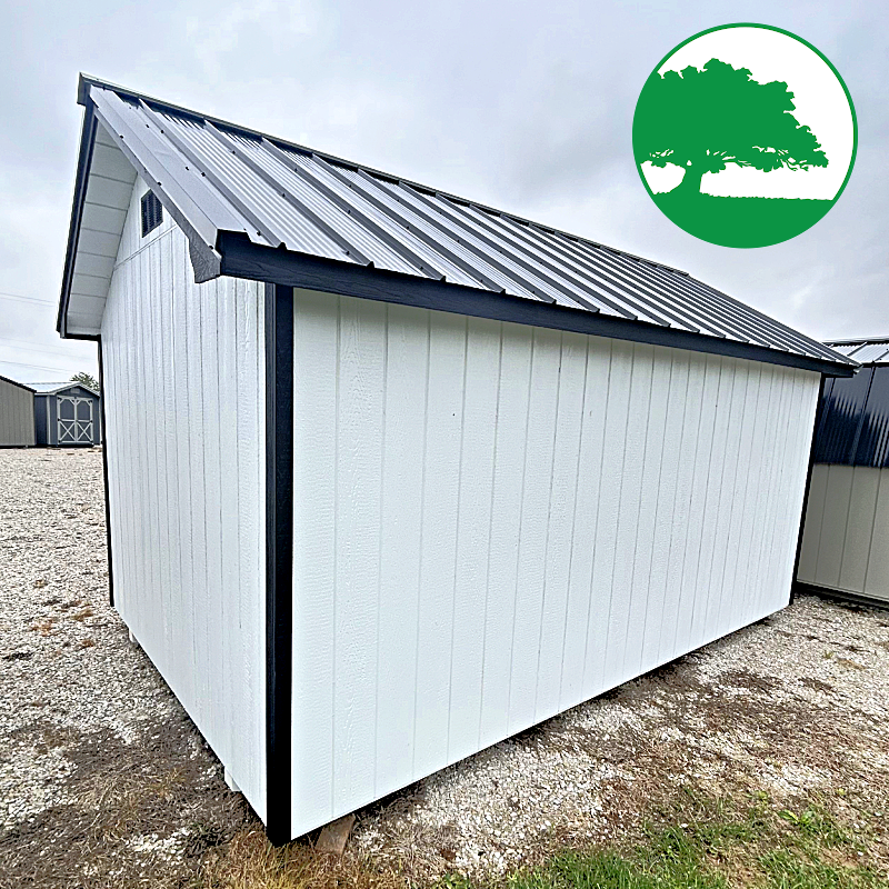 Features: Generous Roof Overhangs, Upgraded Roof Pitch, Soffit in Overhangs, 6’6″ Sidewall Height, Classic 5′ Double Doors, Double 10′ Shelf, (2) 24″ x 30″ Aluminum Windows w/ Shutters, 2″ x 4″ Floor Joists (12″ o.c.), Wall Studs (16″ o.c.), Rafters (24″ o.c.),  DuraTemp Plywood Siding (50 Year Warranty), LP ProStruct Coated Flooring, 1/2″ OSB Roof Sheeting, Baked-On Enamel Metal (50 Year Warranty) & FREE Delivery with blocks within 50 miles.