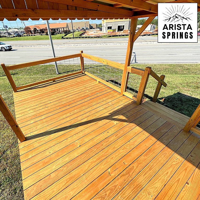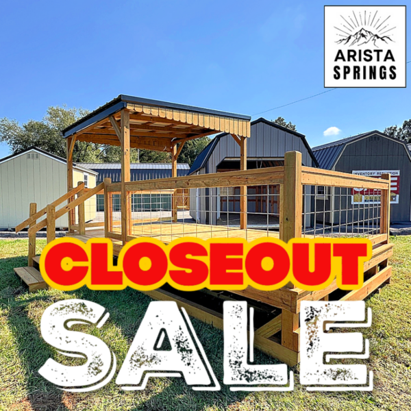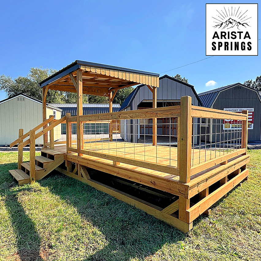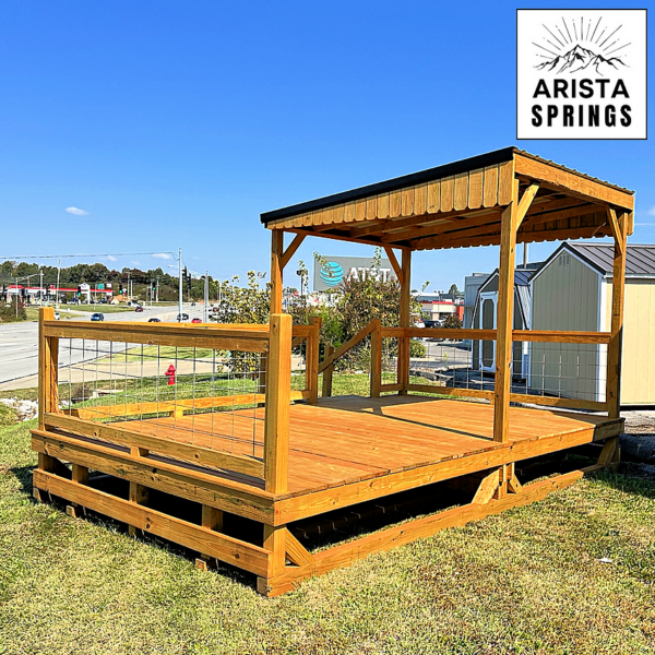 Features: 4′ x 4′ Posts, 5/4″ x 6″ Decking, 4″ x 6″ Pressure Treated Runners, 29 Gauge Metal Roof, Approx 3′ Single opening w/ steps (Steps are built to code w/ (2) handrails), Free Delivery with Blocks, Wire Panel Upgrade – $144