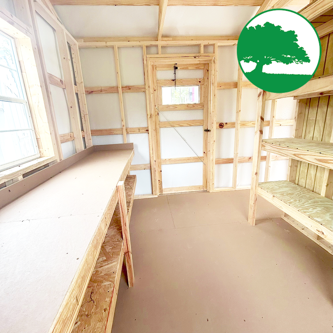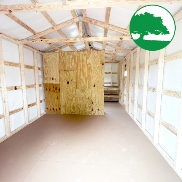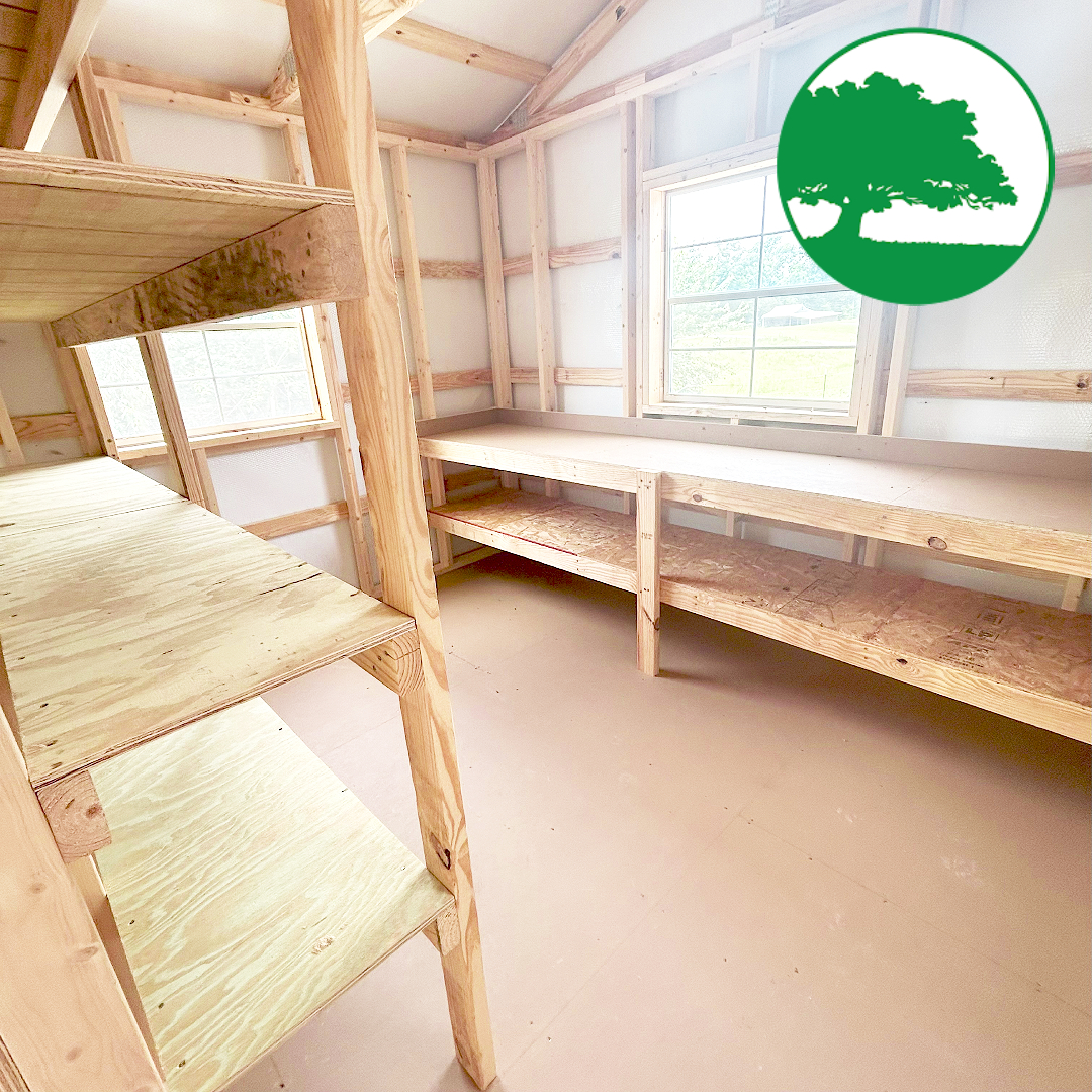 Features: 6′ Double Doors, 7’8″ Wall Height, (2) 2′ x 3′ Aluminum Window w/ PVC Shutters, 12′ Heavy Duty Workbench, Studded Divider Wall w/ OSB, 4-Tier Plywood Shelving, Single Entry w/ Transom Window, Baked-On Enamel Metal Roofing w/ Bubble Wrap below, Bubble Wrap Walls, 6′ Double Ramp Set, LP ProStruct Flooring w/ SmartFinish, Heavy Duty aluminum diamond plate threshold & FREE Delivery with blocks within 50 miles.