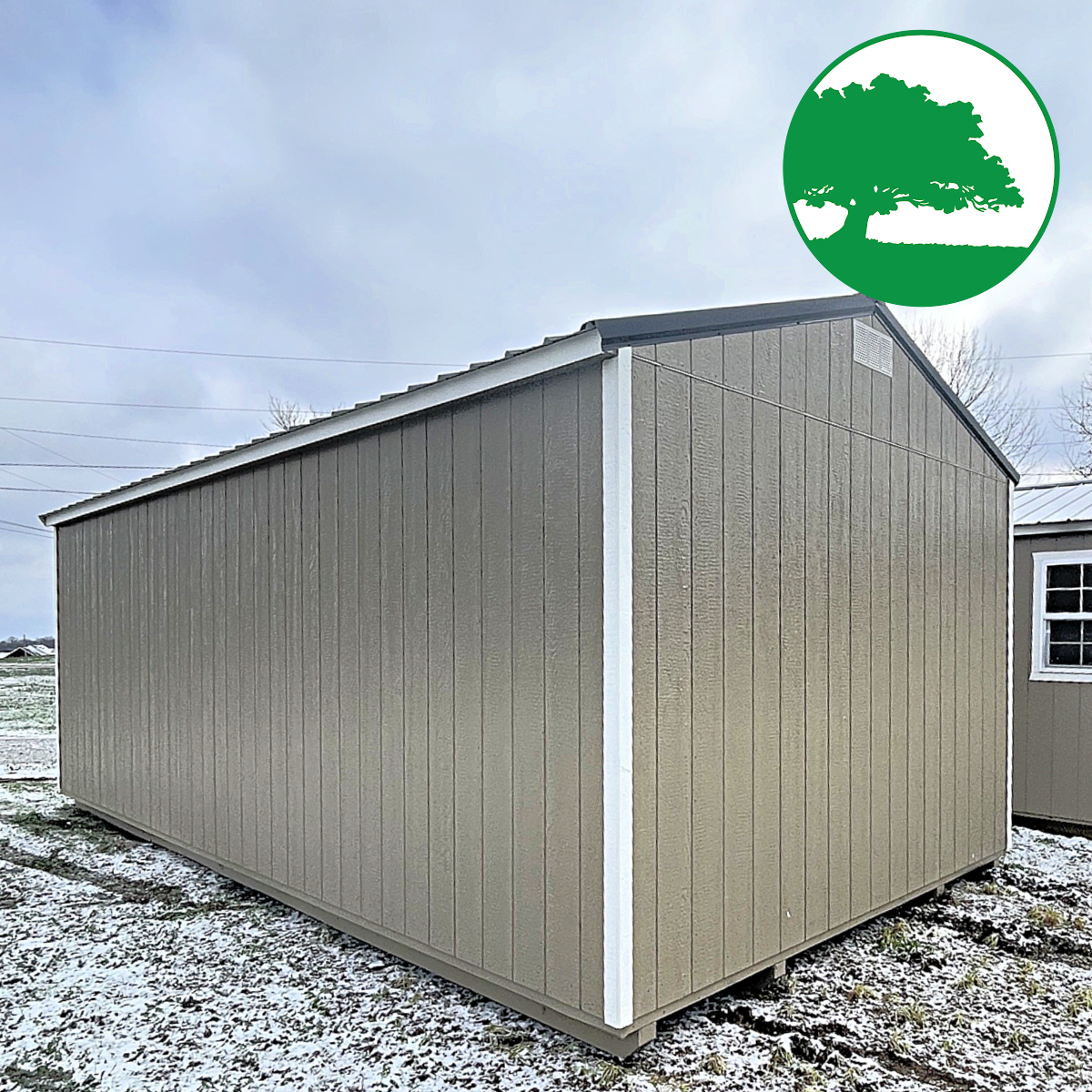 Features: 9′ x 7′ Roll-Up Door (Sandstone), 6 Panel (Solid) Entry Door, (2) 2′ x 3′ Aluminum Windows w/ Shutters (Black), 3-Tier OSB Shelving (16″ deep), 4′ x 12′ Overhead Loft, 8′ TALL Walls, 3-Tier OSB Shelving (16″ deep), LP SmartSide Siding (50 Year Warranty)