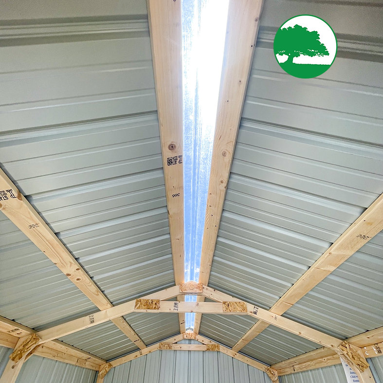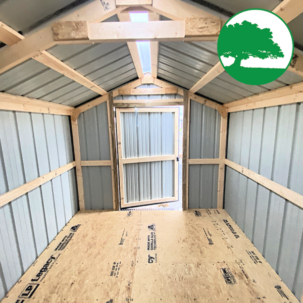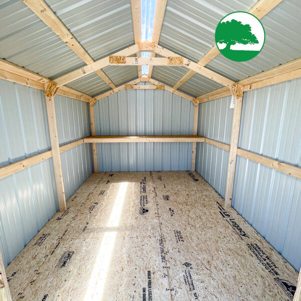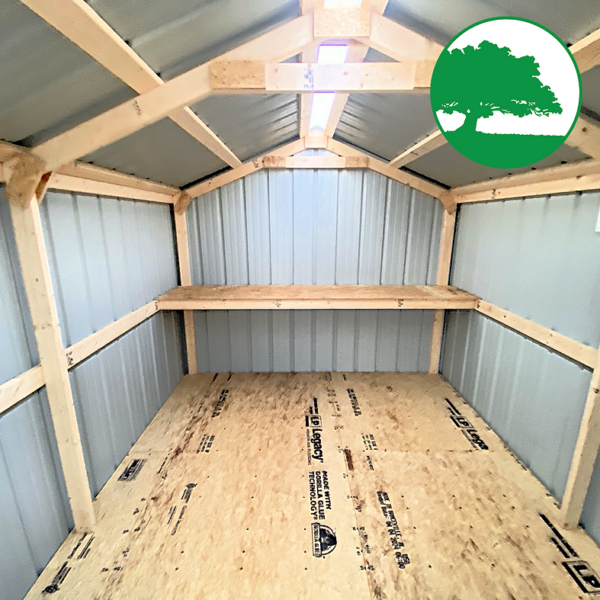 Features: Single Entry Door, Lighted Ridge Cap, 23″ Deep Shelf on Back Wall, Seal Tite Screws, LP Legacy tongue & groove Flooring