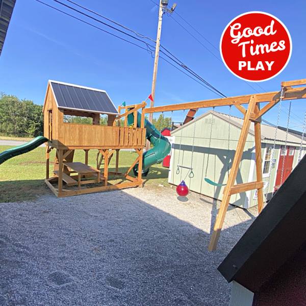 beams / accessories: tall swing pole, 4 position swing beam with (2) belt swings, buoy ball & ez ryder (2-kid swing)