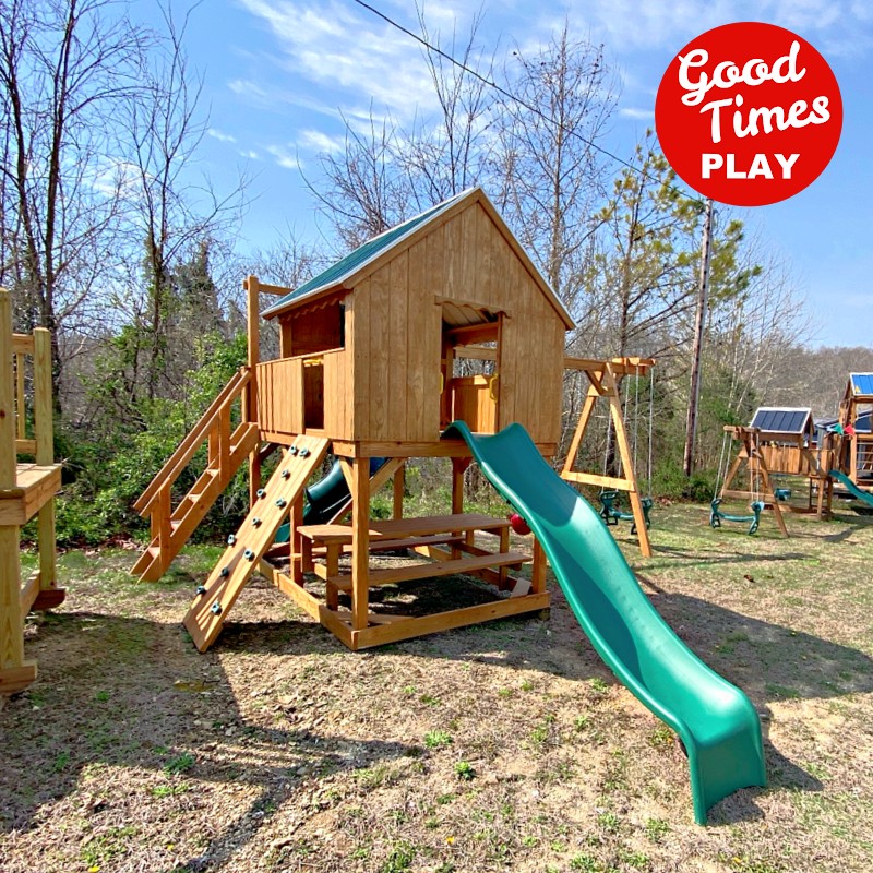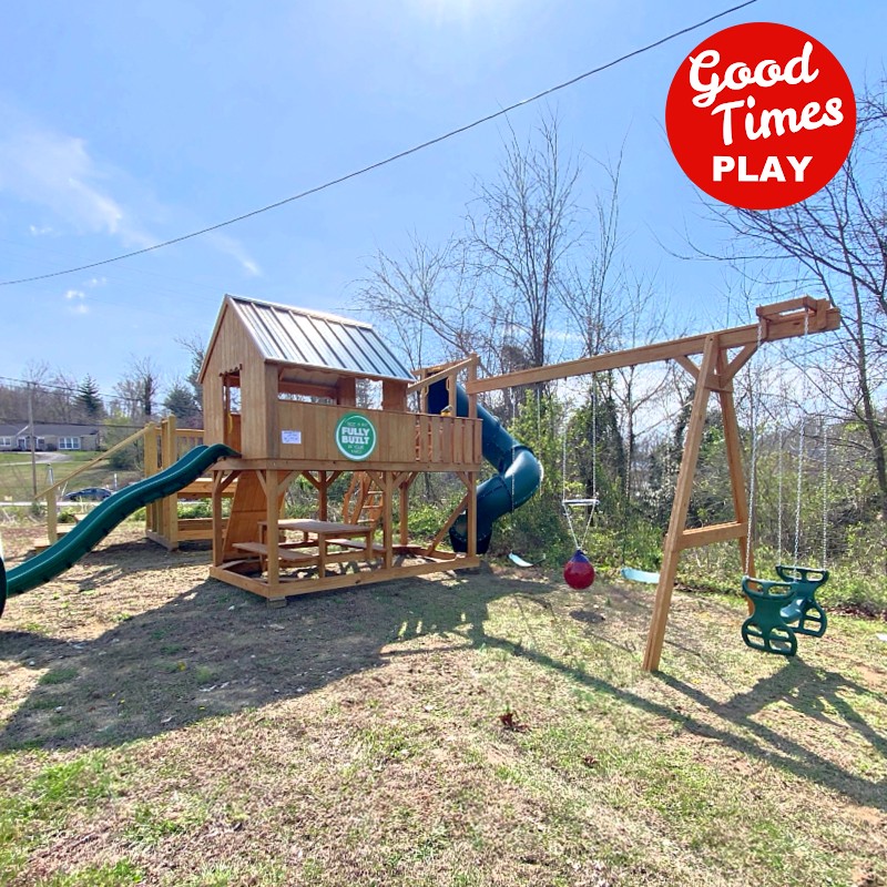 beams / accessories: tall swing pole, 4 position swing beam with (2) belt swings, buoy ball & ez ryder (2-kid swing)