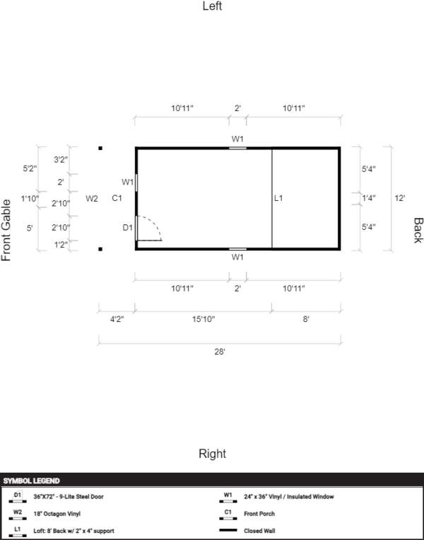 Additional Features: Covered Porch, 9-Lite (1/2 Glass) Entry, (3) 2′ x 3′ Vinyl / Insulated Windows, 22′ Interior Stud Walls, 18″ Vinyl / Insulated Octagon Window, LP SmartSide Siding (50 Year Warranty) LP Legacy Tongue & Groove Flooring & FREE Delivery with blocks within 50 miles.