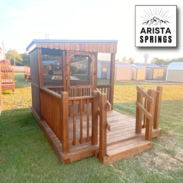 Features: 4′ x 4′ Posts, 5/4″ x 6″ Decking, 4″ x 6″ Pressure Treated Runners, 29 Gauge Metal Roof, Approx 3′ Single opening w/ steps (*Steps are built to code w/ (2) handrails), Free Delivery with Blocks