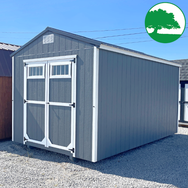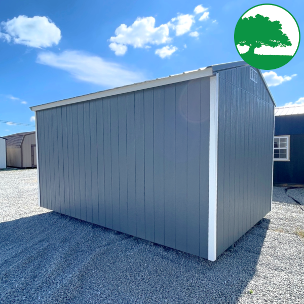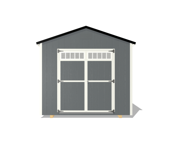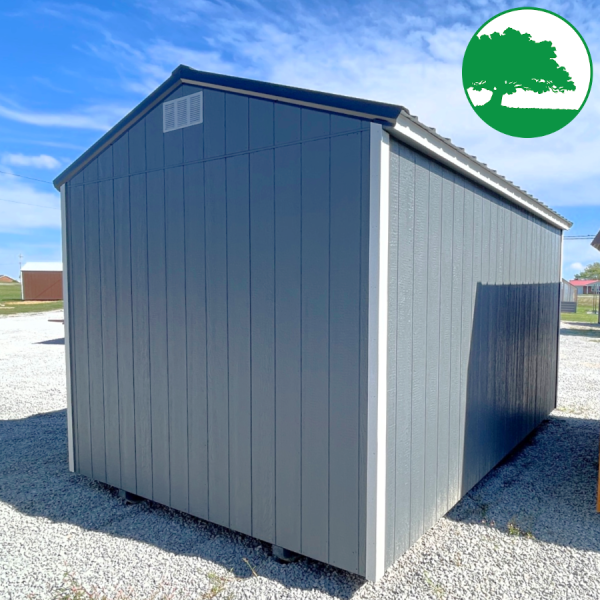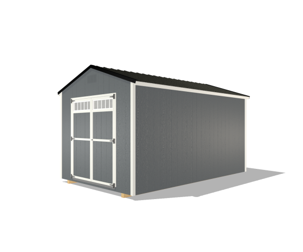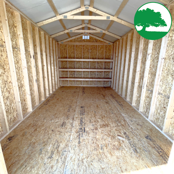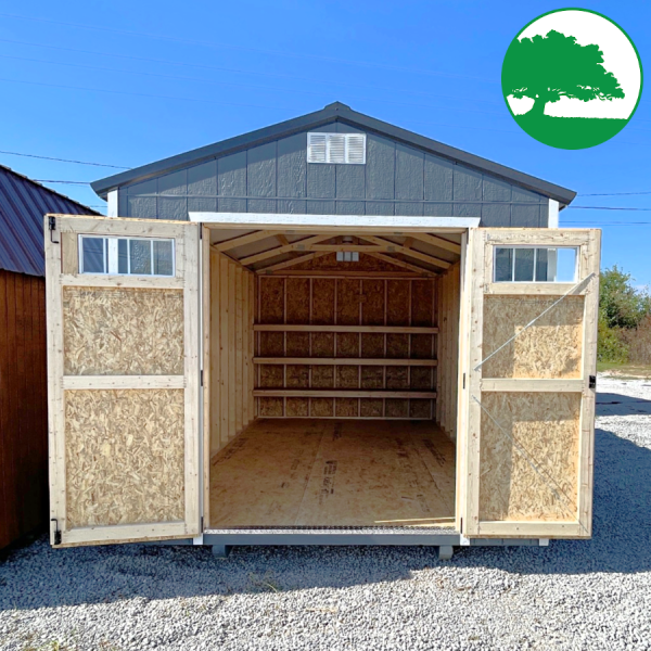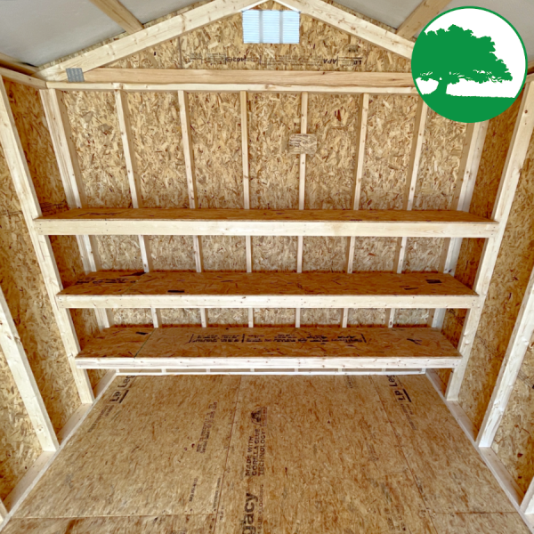Features: Double Entry Doors, 8′ TALL Walls, 3-Tier OSB Shelving (16″ deep), LP SmartSide Siding (50 Year Warranty)